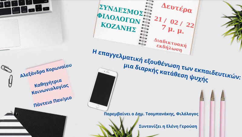 Ο Σύνδεσμος Φιλολόγων Κοζάνης διοργανώνει διαδικτυακή εκδήλωση τη Δευτέρα 21 Φεβρουαρίου και ώρα 7 μ. μ., με προσκεκλημένη την καθηγήτρια Αλεξάνδρα Κορωναίου, με θέμα: «Η επαγγελματική εξουθένωση των εκπαιδευτικών: μια διαρκής κατάθεση ψυχής»