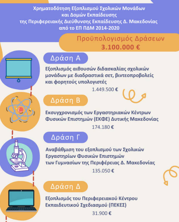 Η Πράξη περιλαμβάνει: α) Εξοπλισμό Τεχνολογίας, Πληροφορίας και Επικοινωνιών για Νηπιαγωγεία, Δημοτικά Σχολεία, Γυμνάσια, Γενικά Λύκεια και Σχολικές Μονάδες Ειδικής Αγωγής, β) Εργαστηριακό εξοπλισμό και εξοπλισμό πληροφορικής για τον εκσυγχρονισμό των Εργαστηριακών Κέντρων Φυσικών Επιστημών (Ε.Κ.Φ.Ε.), γ) Εργαστηριακό εξοπλισμό για την αναβάθμιση των Σχολικών Εργαστηρίων Φυσικών Επιστημών όλων των Γυμνασίων, δ) Ηλεκτρονικό και τεχνολογικό εξοπλισμό για το Περιφερειακό Κέντρο Εκπαιδευτικού Σχεδιασμού (ΠΕ.Κ.Ε.Σ.) Δυτικής Μακεδονίας, ε) Ηλεκτρονικό και τεχνολογικό εξοπλισμό για τους Πόλους Εκπαιδευτικής Καινοτομίας, Πληροφορίας και Επικοινωνιών (Π.Ε.Κ.Τ.Π.Ε.), που δημιούργησε ως δράσεις καινοτομίας η ΠΔΕ Δυτικής Μακεδονίας, στ) Εργαστηριακό και ηλεκτρονικό εξοπλισμό για τον εκσυγχρονισμό των Κέντρων Περιβαλλοντικής Εκπαίδευσης/Κέντρων Εκπαίδευσης για το Περιβάλλον και την Αειφορία (Κ.Π.Ε./Κ.Ε.ΠΕ.Α.), ζ) Τεχνολογικό εξοπλισμό και εξοπλισμό πληροφορικής για τα
