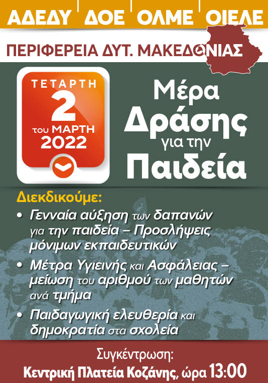 Εκπρόσωποι από την Α.Δ.Ε.Δ.Υ. και τις τρεις εκπαιδευτικές Ομοσπονδίες (Δ.Ο.Ε.-Ο.Λ.Μ.Ε.-Ο.Ι.Ε.Λ.Ε.) θα παρευρίσκονται στις διήμερες δράσεις για την Παιδεία στη Δυτική Μακεδονία, με επίκεντρο την πόλη της Κοζάνης.