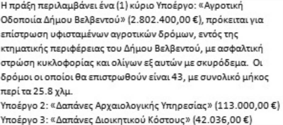 Υπογράφηκε η ένταξη στο πρόγραμμα Τρίτσης της πρότασης του Δήμου Βελβεντού για έργα αγροτικής οδοποιίας, 43 δρόμων συνολικού μήκους 25,8 χλμ, ύψους 2.957.436 Ευρώ, όπως περιγράφεται στον σχετικό πίνακα. Για μία ακόμα φορά ευχαριστούμε τον Αναπληρωτή Υπουργό Εσωτερικών κ Πέτσα για τη σταθερή στήριξη της περιοχής μας.