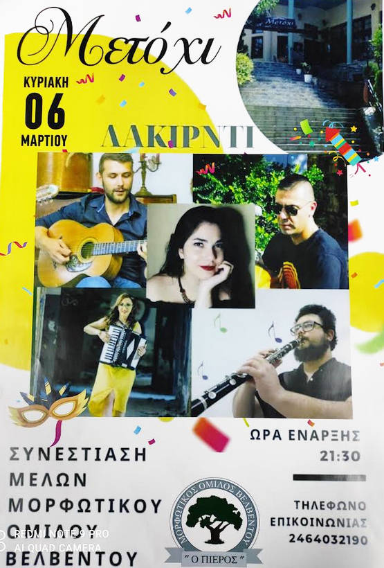 Ο Μορφωτικός Όμιλος Βελβεντού σας προσκαλεί στην καθιερωμένη συνεστίαση των μελών του, την Κυριακή της Μεγάλης Αποκριάς 6 Μαρτίου. Ώρα έναρξης 9.30 μ.μ. στο εξοχικό κέντρο “ΜΕΤΟΧΙ”.