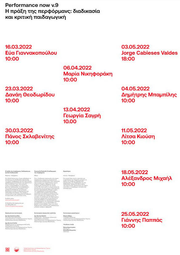 Το ένατο Performance now θα πραγματοποιηθεί στο Τμήμα Εικαστικών και Εφαρμοσμένων Τεχνών του Πανεπιστημίου Δυτικής Μακεδονίας και θα συμπεριλαμβάνει διαλέξεις, εργαστήρια και μία στρογγυλή τράπεζα. Στο Performance now v.9 εστιάζει στις διαδικασίες παραγωγής των έργων περφόρμανς και στις ερευνητικές μεθοδολογικές δυνατότητες που προκύπτουν από την εξέταση τους. Πώς μπορούν αυτές ν’ αναπαραχθούν ως μέρος μιας κριτικής παιδαγωγικής της περφόρμανς; Πώς μπορεί αυτή να προωθήσει τη μη ιεραρχική εκπαίδευση, τη συλλογική δημιουργία γνώσης, τη δημοκρατική και απελευθερωτική δράση; Πώς μπορεί η γνώση αυτή να έχει εφαρμογή και επίδραση σε άλλα πεδία της κοινωνικής ζωής;