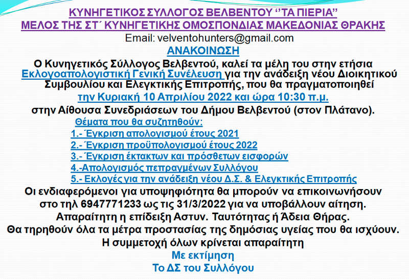 Ανακοίνωση του Κυνηγετικού Συλλόγου Βελβεντού για την Ετήσια Εκλογοαπολογιστική Γενική Συνέλευση: