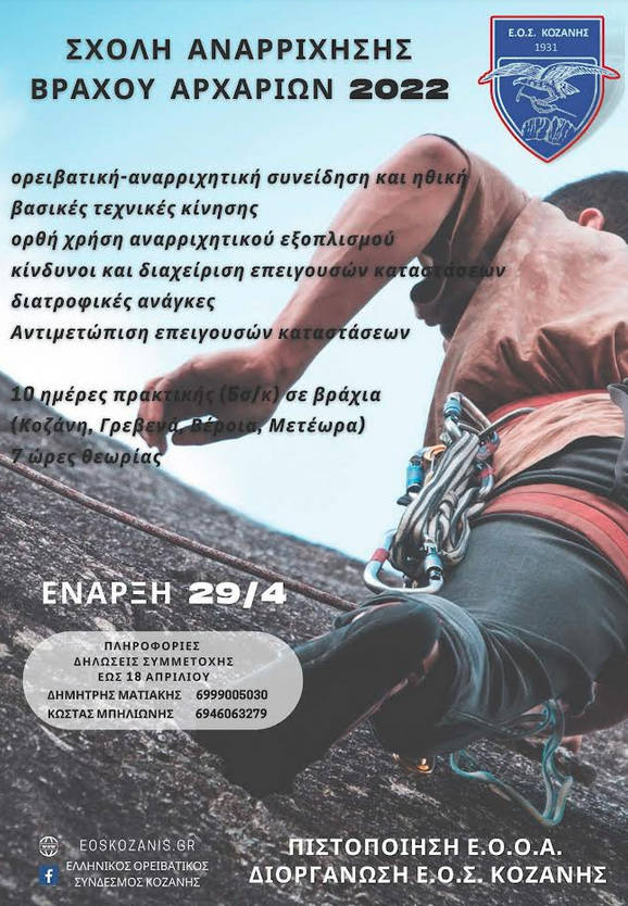 Ο Ε.Ο.Σ. Κοζάνης, υπό την αιγίδα της Ελληνικής Ομοσπονδίας Ορειβασίας Αναρρίχησης, προκηρύσσει την διοργάνωση Σχολής Αναρρίχησης Βράχου Αρχαρίων τον Απρίλιο του 2022.