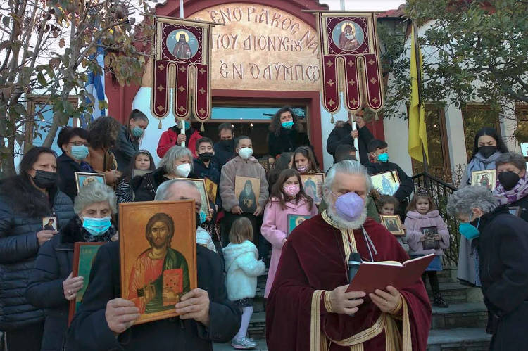 Με συμμετοχή παιδιών (και πολλών πιστών) έγινε η λιτάνευση των αγίων εικόνων και των ιερών λαβάρων (της Παναγίας και του Αγίου Διονυσίου) την Κυριακή της Ορθοδοξίας 2022, στο ηλιόλουστο προαύλιο και γύρω από το Ναό (με τήρηση του υγειονομικού πρωτόκολλου) στον Άγιο Διονύσιο εν Ολύμπω στο Βελβεντό, της Ιεράς Μητροπόλεως Σερβίων και Κοζάνης. Κάθε παιδί κρατούσε μία εικόνα του Ναού.