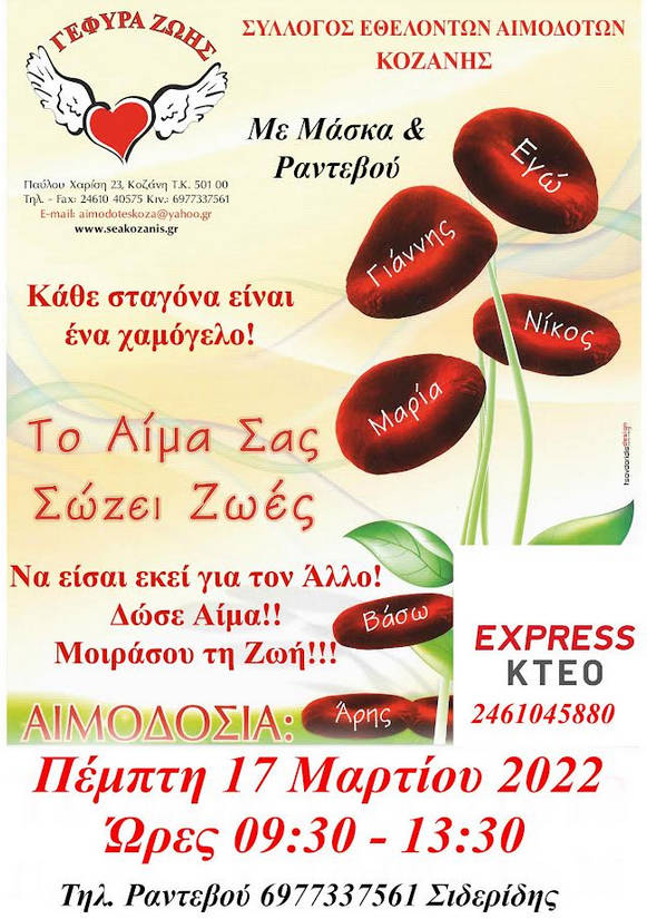Η 6η Αιμοδοσία του 2022 γίνεται την Πέμπτη 17 Μαρτίου 2022 από τις 09:30 – 13:30, στο χώρο του ΚΤΕΟ στα Κοίλα με την Αιμοδοσία του Γ.Ν. Κοζάνης.