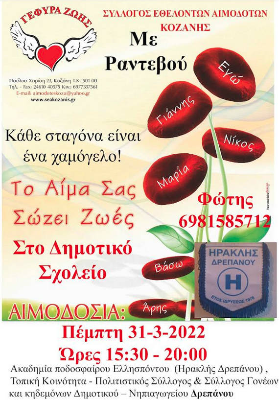 Την Πέμπτη 31 Μαρτίου 2022 και ΩΡΑ 15:30-20:30 (προσέλευση 20:00) στον χώρο του Δημοτικού Σχολείου του Δ.Δ. Δρεπάνου θα γίνει Αιμοδοσία σε συνεργασία με την Ακαδημία ποδοσφαίρου Ελλησπόντου (Ηρακλής Δρεπάνου), Τοπική Κοινότητα, Πολιτιστικό Σύλλογο & Σύλλογο Γονέων και Κηδεμόνων Δημοτικού – Νηπιαγωγείου Δρεπάνου & την Αιμοδοσία του Γ.Ν. Κοζάνης.