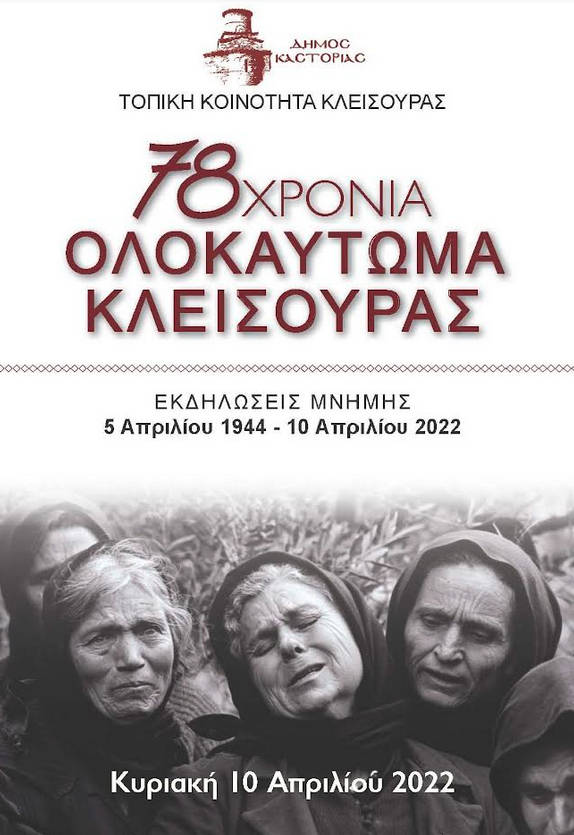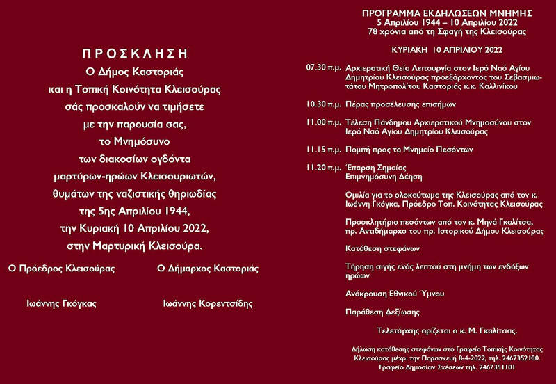 Ο Δήμος Καστοριάς και η Τοπική Κοινότητα Κλεισούρας σας προσκαλούν να τιμήσετε με την παρουσία σας, το Μνημόσυνο των διακοσίων ογδόντα μαρτύρων-ηρώων Κλεισουριωτών, θυμάτων της ναζιστικής θηριωδίας της 5ης Απριλίου 1944, την Κυριακή 10 Απριλίου 2022, στην Μαρτυρική Κλεισούρα.