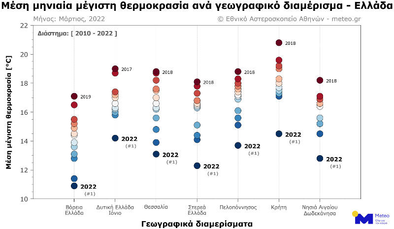 Σύμφωνα με τις καταγραφές των μετεωρολογικών σταθμών του Εθνικού Αστεροσκοπείου Αθηνών/meteo.gr, η μέση θερμοκρασία του Μαρτίου ήταν χαμηλότερη και από τους 3 μήνες του φετινού χειμώνα στη Θεσσαλία, τη Στερεά Ελλάδα, την Πελοπόννησο, την Κρήτη και τα Νησιά του Αιγαίου. Επιπρόσθετα, σύμφωνα με τις καταγραφές των ίδιων 53 μετεωρολογικών σταθμών, η μέση τιμή της μέγιστης ημερήσιας θερμοκρασίας ήταν η χαμηλότερη της περιόδου 2010-2021 σε όλη τη χώρα.