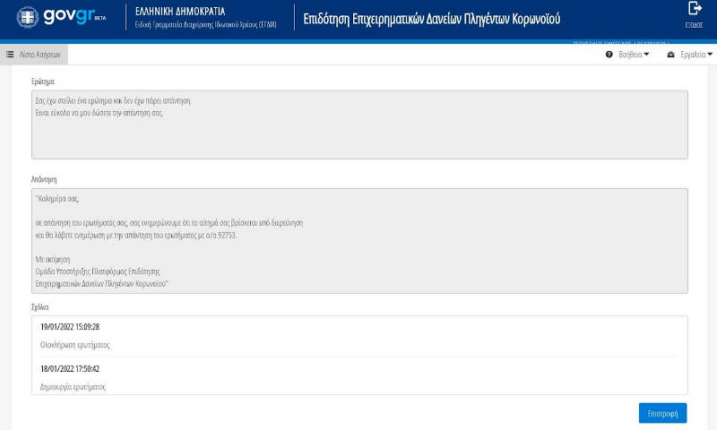 Σαν πληττόμενη επιχείρηση και εγώ έχω κάνει αίτηση ώστε να ενταχτώ και εγώ όπως χιλιάδες επιχειρήσεις στο πρόγραμμα Γέφυρα ΙΙ στις 21-05-2021 και περιμένοντας μετά από κάποιο διάστημα να έχω μια απάντηση.