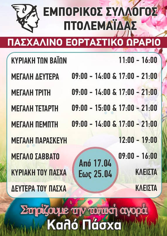 Ενημερώνουμε τους καταναλωτές, εργαζόμενους και εμπόρους για το Πασχαλινό Εορταστικό Ωράριο των Καταστημάτων. Σας ευχόμαστε υγεία και καλές αγορές.
