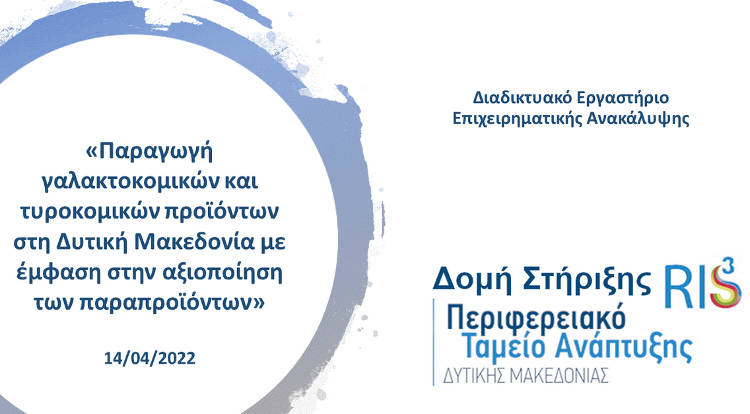 Διοργάνωση Διαδικτυακού Εργαστηρίου Επιχειρηματικής Ανακάλυψης με θέμα «Παραγωγή γαλακτοκομικών και τυροκομικών προϊόντων στη Δυτική Μακεδονία με έμφαση στην αξιοποίηση των παραπροϊόντων»