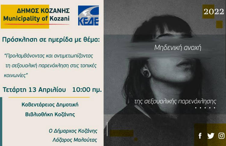 «Προλαμβάνοντας και αντιμετωπίζοντας τη σεξουαλική παρενόχληση στις τοπικές κοινωνίες», τιτλοφορείται η ημερίδα που διοργανώνεται με πρωτοβουλία της Επιτροπής Ισότητας της Κεντρικής Ένωσης Δήμων (Κ.Ε.Δ.Ε.) σε συνεργασία με το Δήμο Κοζάνης, την Τετάρτη 13 Απριλίου 2022, στις 10:00, στην Κοβεντάρειο Δημοτική Βιβλιοθήκη Κοζάνης.