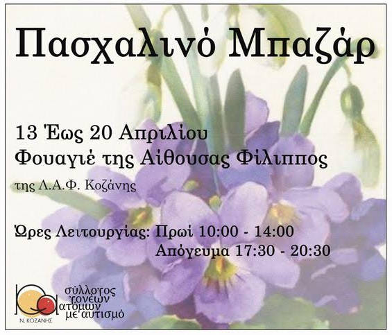 Κοζάνη 13/04/2022 Πασχαλινό μπαζάρ του Συλλόγου Γονέων Ατόμων με Αυτισμό Κοζάνης 0 Πασχαλινό μπαζάρ του Συλλόγου Γονέων Ατόμων με Αυτισμό Κοζάνης: