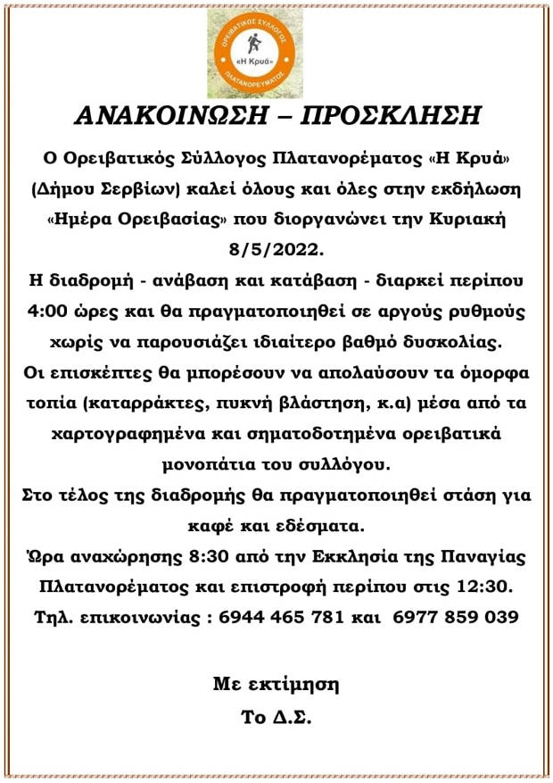 Σέρβια - Βελβεντό 03/05/2022 «Ημέρα Ορειβασίας» την Κυριακή 8 Μαΐου από τον Ορειβατικό Σύλλογο Πλατανορέματος 2 «Ημέρα Ορειβασίας» την Κυριακή 8 Μαΐου από τον Ορειβατικό Σύλλογο Πλατανορέματος: