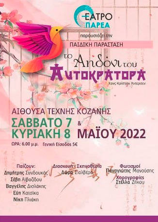 Την παιδική θεατρική παράσταση «Το Αηδόνι του Αυτοκράτορα» του Χανς Κρίστιαν Άντερσεν παρουσιάζει στην Αίθουσα Τέχνης Κοζάνης στις 7 & 8 Μαΐου 2022 η νεοσύστατη θεατρική παρέα της πόλης «Θέατρο ΠΑΡΕΑ».