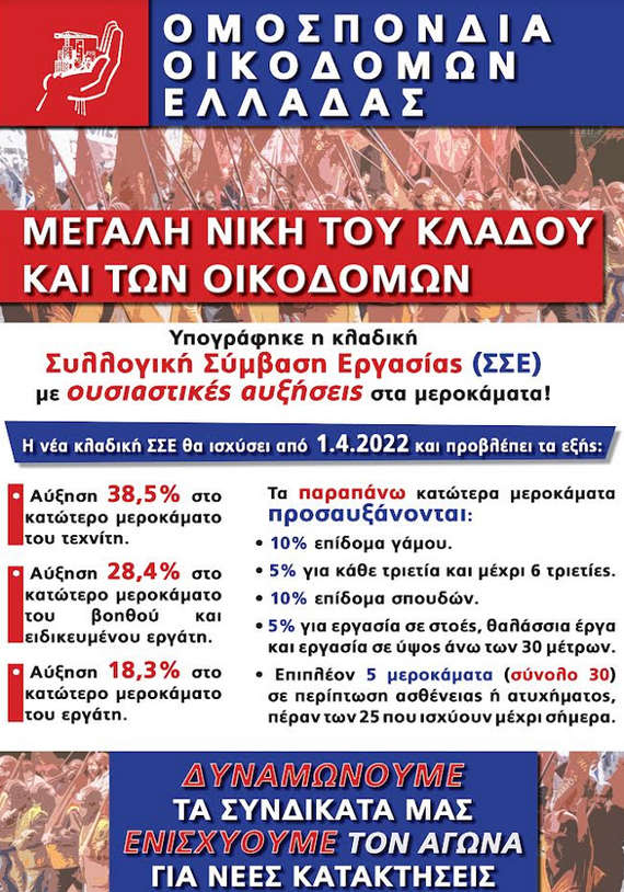 Η Ομοσπονδία Οικοδόμων & Συναφών Επαγγελμάτων Ελλάδας, μετά τη συνάντηση με τις εργοδοτικές οργανώσεις του κλάδου των Οικοδόμων σήμερα Πέμπτη 28 Απρίλη 2022, ανακοινώνει την υπογραφή κλαδικής ΣΣΕ.