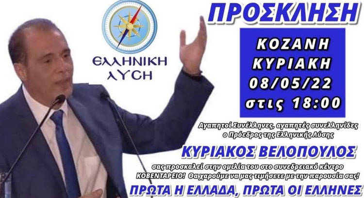 Πολιτικά 04/05/2022 Πρόσκληση για την ομιλία του προέδρου της Ελληνικής Λύσης Κυριάκου Βελόπουλου στην Κοζάνη 0 Πρόσκληση για την ομιλία του προέδρου της Ελληνικής Λύσης Κυριάκου Βελόπουλου στην Κοζάνη την Κυριακή 8 Μαΐου στις 18:00 στο Κοβεντάρειο: