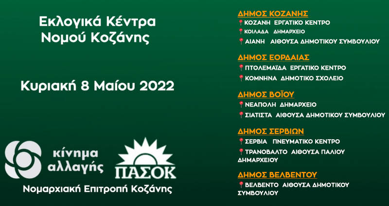 Πολιτικά 06/05/2022 ΚΙΝΑΛ: Τα Εκλογικά Κέντρα των εσωκομματικών εκλογών της 8ης Μαΐου 2022 στην Π.Ε. Κοζάνης 0 Ν.Ε. Κινήματος Αλλαγής Κοζάνης: Τα Εκλογικά Κέντρα των εσωκομματικών εκλογών της 8ης Μαϊου 2022 στην Π.Ε. Κοζάνης: