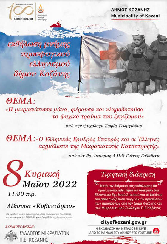 Ο Δήμος Κοζάνης και ο Μικρασιατικός Σύλλογος Π.Ε Κοζάνης σας προσκαλούν την Κυριακή 8 Μαΐου και ώρα 11.30 π.μ στην αίθουσα «Κοβεντάρειο» στην εκδήλωση που θα γίνει στο πλαίσιο των 100 χρόνων Μνήμης Προσφυγικού Ελληνισμού Δήμου Κοζάνης.