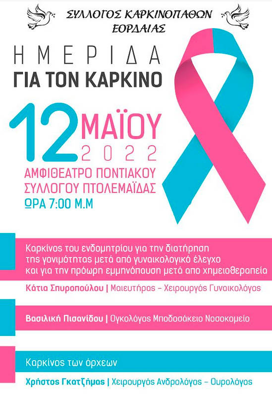 Ο Σύλλογος Καρκινοπαθών Εορδαίας, διοργανώνει Ημερίδα με θέμα τον ¨Καρκίνο” στις 12 Μαΐου 2022 και ώρα 7μ.μ. στο Αμφιθέατρο του Ποντιακού Συλλόγου Πτολεμαΐδας και καλεί όλους να παρευρεθούν.