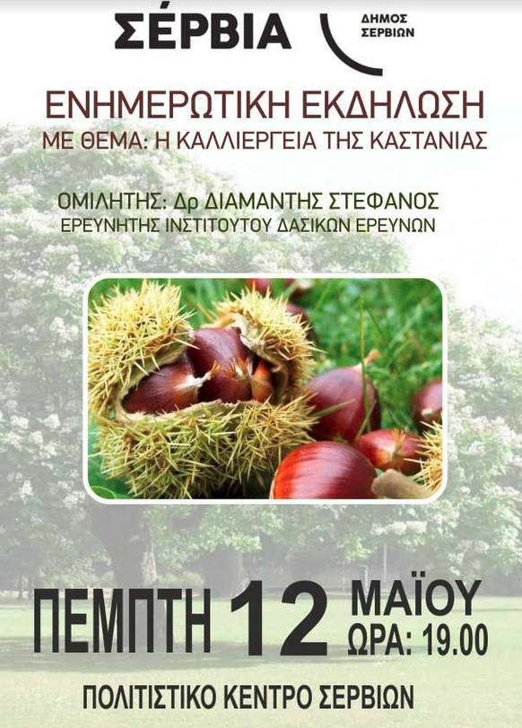 Ο Δήμος Σερβίων πάντα δίπλα στον πολίτη – αγρότη – παραγωγό διοργανώνει ενημερωτική εκδήλωση με θέμα “Η καλλιέργεια της καστανιάς” με ομιλητή τον Δρ.Διαμαντή Στέφανο, ερευνητή Ινστιτούτου δασικών ερευνών.