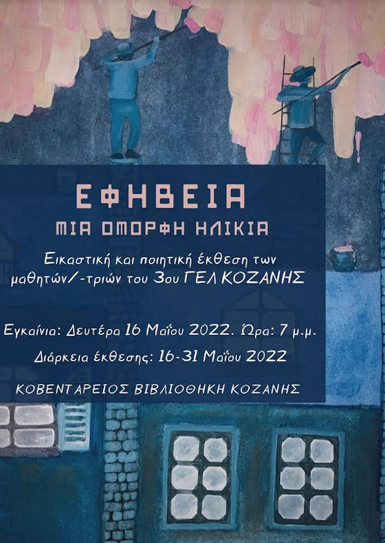 Το 3ο ΓΕΛ Κοζάνης και η μαθητική ομάδα του περιοδικού ΟΝΕΙΡΑ ΨΥΧΩΝ σας προσκαλούν στην εικαστική και ποιητική τους έκθεση στην Κοβεντάρειο Δημοτική Βιβλιοθήκη Κοζάνης με τίτλο ΕΦΗΒΕΙΑ: ΜΙΑ ΟΜΟΡΦΗ ΗΛΙΚΙΑ