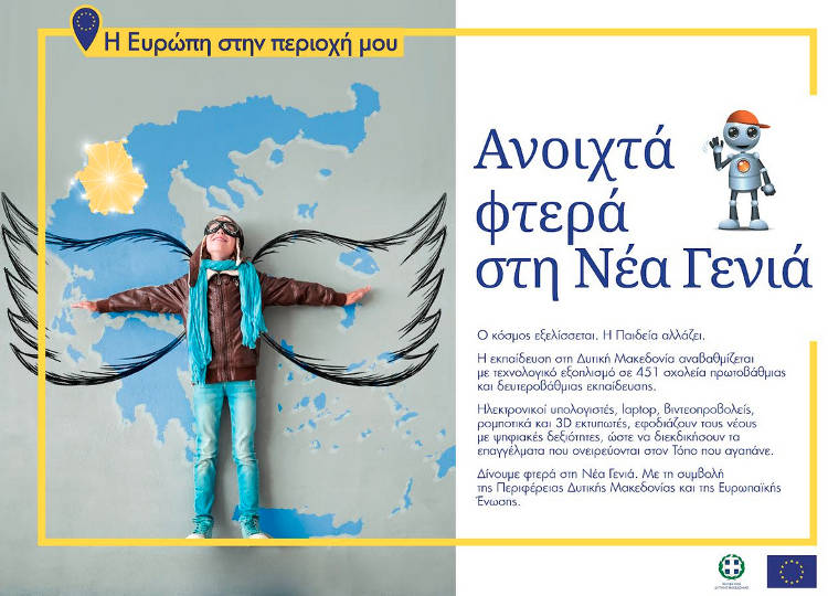 Η αναβάθμιση του τεχνολογικού εξοπλισμού 451 σχολείων στη Δυτική Μακεδονία, εφοδιάζει τη Νέα Γενιά με δεξιότητες και τη βοηθά να ανοίξει τα φτερά της, διεκδικώντας μια θέση στα επαγγέλματα του μέλλοντος. Όπως λέει και το σλόγκαν της καμπάνιας: «Με ανοιχτά φτερά», η Νέα Γενιά μπορεί να καταφέρει τα πάντα εδώ, στον τόπο της.»