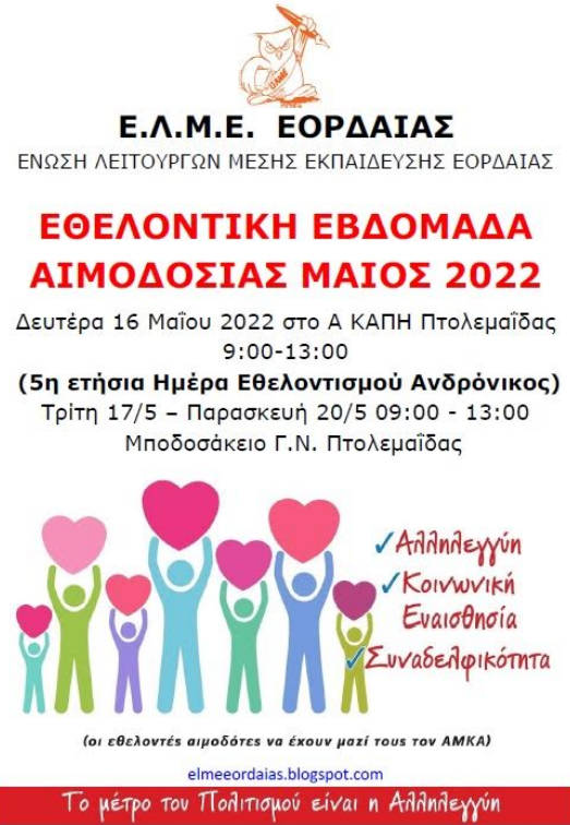 Η ΕΛΜΕ Εορδαίας συμμετέχει στις δράσεις της ομάδας εθελοντισμού Ανδρόνικος με την καθιερωμένη αιμοδοσία των μελών της και προσκαλεί να συμμετέχουν πέρα από εκπαιδευτικούς, γονείς, ενήλικους μαθητές και όποιον άλλο επιθυμεί να δείξει την αλληλεγγύη του προς τον συνάνθρωπό του.