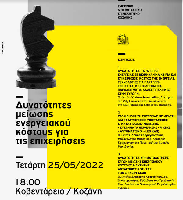 Το Επιμελητήριο Κοζάνης, διοργανώνει μια σημαντική Εκδήλωση, με τίτλο “Δυνατότητες μείωσης ενεργειακού κόστους για τις επιχειρήσεις”, την Τετάρτη 25 Μαΐου 2022 στις 18.00 στην Αίθουσα Κοβεντάρειο στην Κοζάνη. Θα τεθούν ιδιαίτερα ενδιαφέροντα θέματα και λύσεις για το πως μπορούν οι επιχειρήσεις – μέλη μας, να αξιοποιήσουν τις Ανανεώσιμες Πηγές, και τις μεθόδους Εξοικονόμησης για να μειώσουν κατακόρυφα το ενεργειακό τους κόστος.