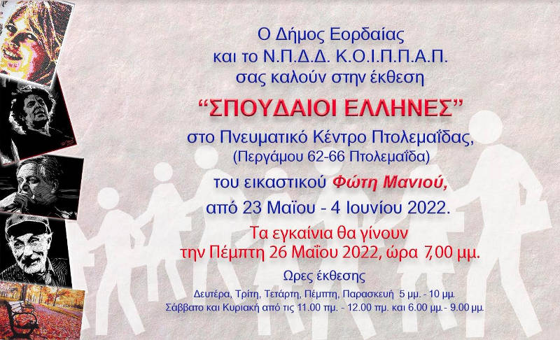Την θεματική έκθεση ζωγραφικής «Σπουδαίοι Έλληνες», του εικαστικού καλλιτέχνη Φώτη Μανιού, θα παρουσιάσει ο Δήμος Εορδαίας και το Ν.Π.Δ.Δ Κοινωνικής Πολιτικής Πολιτιστικής Ανάπτυξης & Παιδείας στο χώρο του Πνευματικού Κέντρου Πτολεμαΐδας.