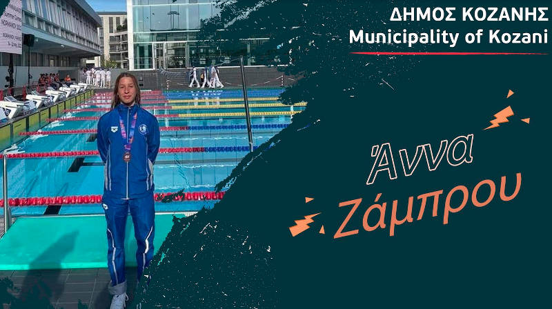 Ο Δήμος Κοζάνης εκφράζει τα θερμά του συγχαρητήρια στην πρωταθλήτρια της κολύμβησης, αθλήτρια της Κολυμβητικής Ένωσης Κοζάνης και μαθήτρια του 3ου Γενικού Λυκείου Κοζάνης, Άννα Ζάμπρου, για την κατάκτηση της 3ης θέσης στην Παγκόσμια Γυμνασιάδα στη Νορμανδία, στα 4*100 μικτή.