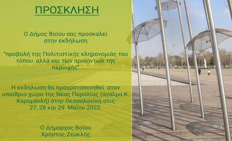 Ο Δήμος Βοΐου διοργανώνει τριήμερο εκδηλώσεων στη Θεσσαλονίκη στο πλαίσιο της ενίσχυσης του τουριστικού brand name του Βοΐου, με την ταυτόχρονη προβολή της πολιτιστικής κληρονομιάς του αλλά και των προϊόντων της περιοχής. Η εκδήλωση θα πραγματοποιηθεί στον υπαίθριο χώρο της Νέας Παραλίας (άγαλμα Κ. Καραμανλή) στην Θεσσαλονίκη στις 27, 28 και 29 Μαΐου 2022.