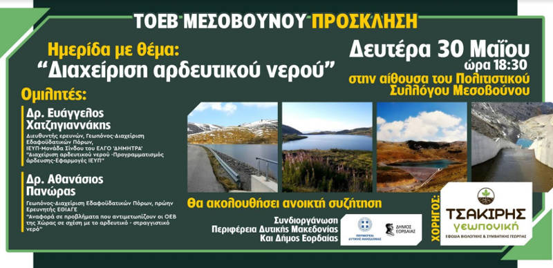 Ο ΤΟΕΒ Μεσοβούνου διοργανώνει ημερίδα τη Δευτέρα 30 Μαΐου στις 6.30 το απόγευμα στην αίθουσα του Πολιτιστικού Συλλόγου με τίτλο: «η διαχείριση του αρδευτικού νερού» στο επίκεντρο της ημερίδας
