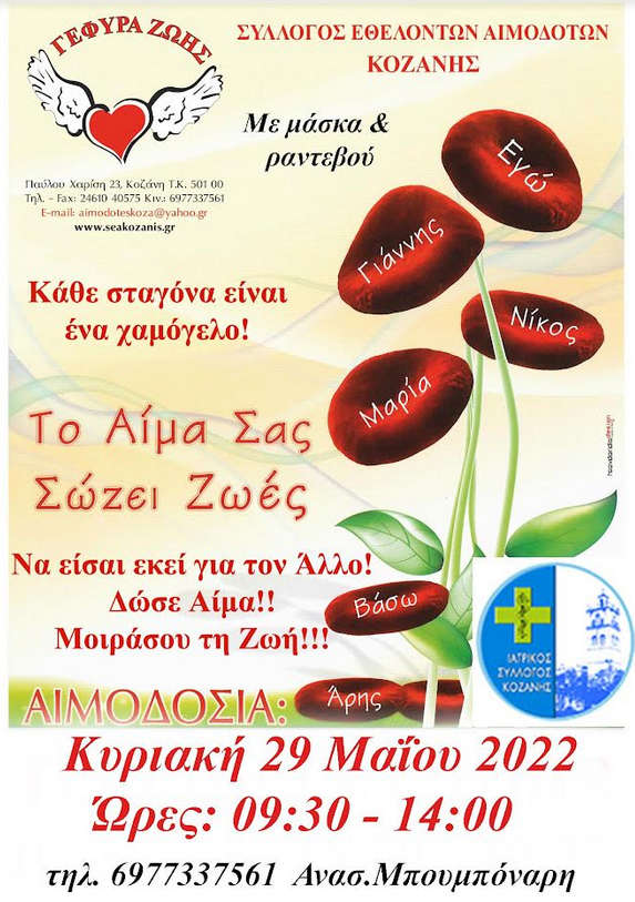 Την Κυριακή 29 Μαΐου Αιμοδοτούμε με τη συμμετοχή & του Ιατρικού Συλλόγου Κοζάνης (ΙΣΚ) από τις 09:30 – 14:30 στα γραφεία του Συλλόγου Αιμοδοτών, Π. Χαρίση 23.
