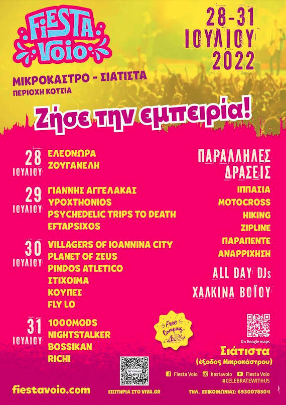 Το FIESTA VOIO κάνει την πρεμιέρα του για να σε ταξιδέψει στον κόσμο της μουσικής. Στις τέσσερις μέρες του, θα διασκεδάσεις μαζί με μεγάλους ερμηνευτές του Ελληνικού Τραγουδιού (Ελεονώρα Ζουγαvέλη), με τα σημαντικότερα ονόματα της Ελληνικής Rock Σκηνής (Γιάννης Αγγελάκας, Villagers of loannina City, Nightstalker, Planet of Zeus, 1000Μods), και μερικά από τα πιο γνωστά σχήματα και δημιουργούς του εγχώριου Hip-Ηop (Ypo, Στίχοιμα, Fly Lo, Pindos Atletiko, Bossikan, Eftapsihos, Richi).