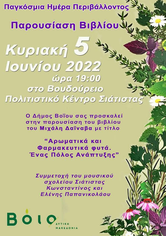 Βόιο 01/06/2022 Παρουσίαση του βιβλίου του Μιχάλη Δαϊναβα «Αρωματικά και φαρμακευτικά φυτά – Ένας πόλος ανάπτυξης» στη Σιάτιστα 0 Παρουσίαση του βιβλίου του Μιχάλη Δαϊναβα «Αρωματικά και φαρμακευτικά φυτά – Ένας πόλος ανάπτυξης» στη Σιάτιστα. Περισσότερες πληροφορίες στην παραπάνω αφίσα.