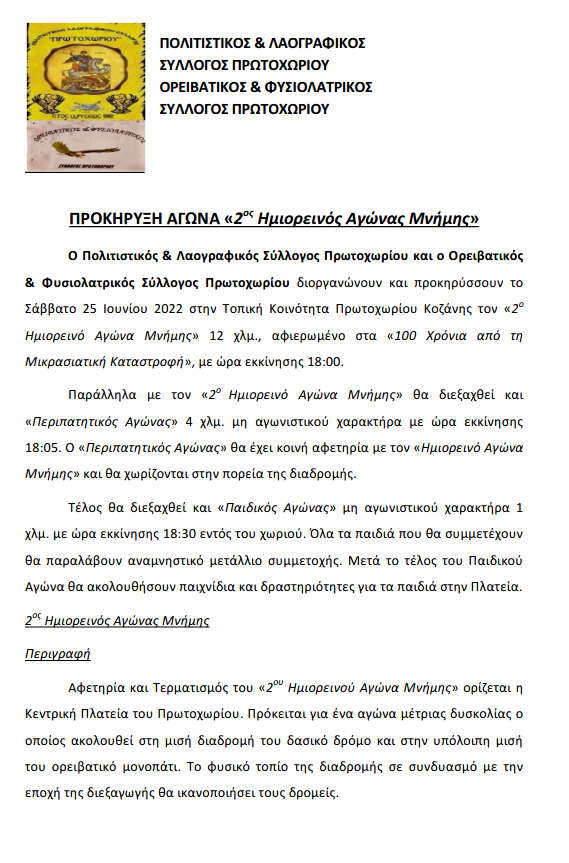 Κοζάνη 07/06/2022 Η προκήρυξη του 2oυ Ημιορεινού Αγώνα Μνήμης στο Πρωτοχώρι Κοζάνης 0 Η προκήρυξη του 2oυ Ημιορεινού Αγώνα Μνήμης στο Πρωτοχώρι Κοζάνης:
