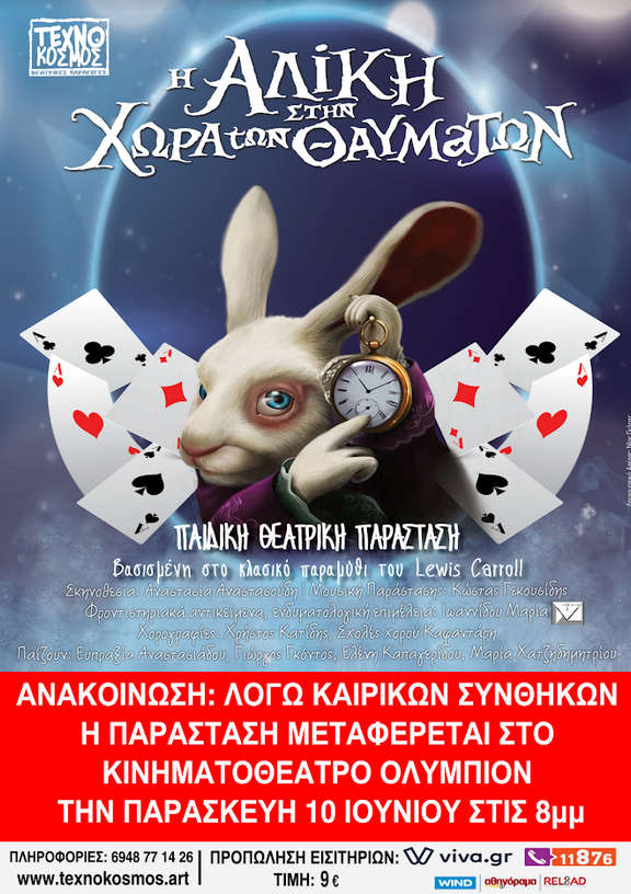 ΑΝΑΚΟΙΝΩΣΗ: ΛΟΓΩ ΚΑΙΡΙΚΩΝ ΣΥΝΘΗΚΩΝ Η ΠΑΡΑΣΤΑΣΗ “Η Αλίκη στην χώρα των Θαυμάτων” ΜΕΤΑΦΕΡΕΤΑΙ ΣΤΟ ΚΙΝΗΜΑΤΟΘΕΑΤΡΟ ΟΛΥΜΠΙΟΝ ΤΗΝ ΠΑΡΑΣΚΕΥΗ 10 ΙΟΥΝΙΟΥ ΣΤΙΣ 8μμ
