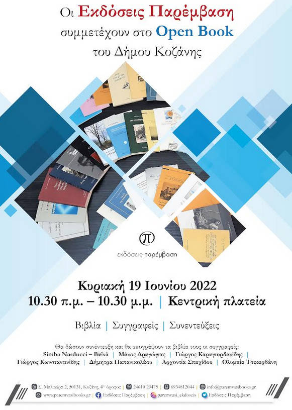 Οι Εκδόσεις Παρέμβαση, την Κυριακή 19 Ιουνίου, από τις 10.30 π.μ. έως τις 10.30 μ.μ., θα συμμετέχουν στο Open Book Festival του Δήμου Κοζάνης, με δικό τους περίπτερο στην Κεντρική πλατεία.
