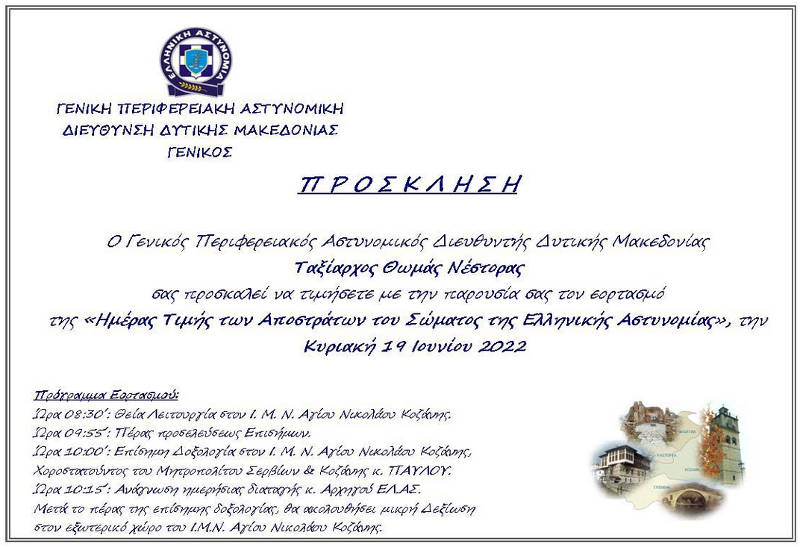 Η Γενική Περιφερειακή Αστυνομική Διεύθυνση Δυτικής Μακεδονίας, απευθύνει πρόσκληση προς τους εκπροσώπους των Θρησκευτικών, Πολιτικών, Δικαστικών, Στρατιωτικών, τοπικών Αρχών και φορέων, τους εκπροσώπους των Μ.Μ.Ε. και συνδικαλιστικών φορέων, τους πολίτες και το αστυνομικό προσωπικό, με τις οικογένειές τους και όσοι επιθυμούν, να τιμήσουν με την παρουσία τους, τους Απόστρατους της Ελληνικής Αστυνομίας.