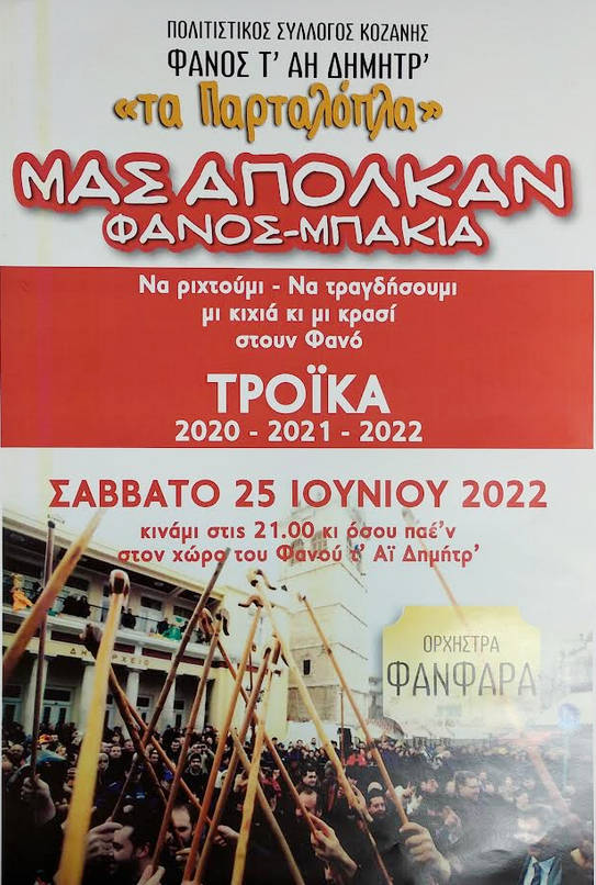 Και κάνουμε φανό Μπακιά «δηλαδή κατόπιν εορτής», γιατί τς απουκρές ήμασταν σφαλσμε’ν. Σας καρτεράμε στον χώρο του φανού τ’ Αι Δημητρ του Σαββάτου 25/06/2022. Κινάμε με το 11 (χορό έντεκα) στις 21.00μμ.