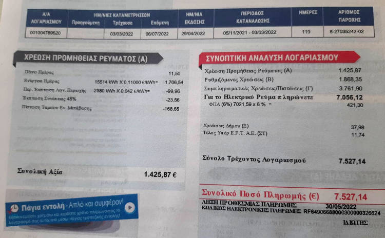 Όπως ομολογούν οι ίδιοι πριν από μερικούς μήνες άλλαξαν πάροχο και προσχώρησαν σε ιδιωτική εταιρεία και ενώ οι αρχικοί λογαριασμοί ήταν από 80 έως και 100 ευρώ, ο προτελευταίος ξεπέρασε τα 900 ευρώ για να έρθει ο εκκαθαριστικός, που ανέρχεται στο ποσό των 7.527,14 ευρώ.