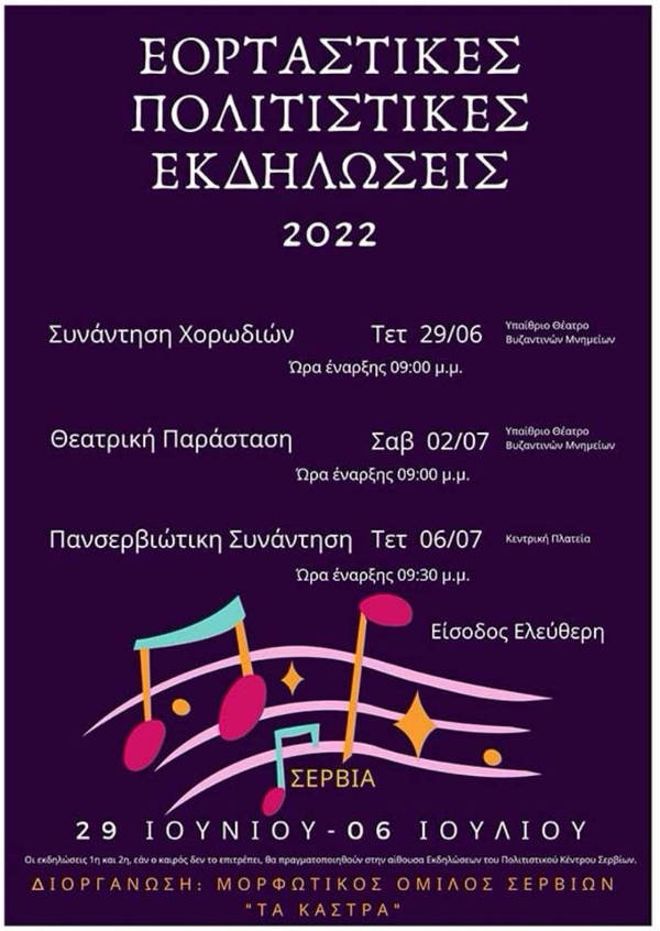 Ο Μορφωτικός Όμιλος Σερβίων «Τα Κάστρα» διοργανώνει οκταήμερο εορταστικών – πολιτιστικών εκδηλώσεων, τιμώντας τη μνήμη της Πολιούχου των Σερβίων, Αγίας Κυριακής, από 29 Ιουνίου έως 6 Ιουλίου 2022
