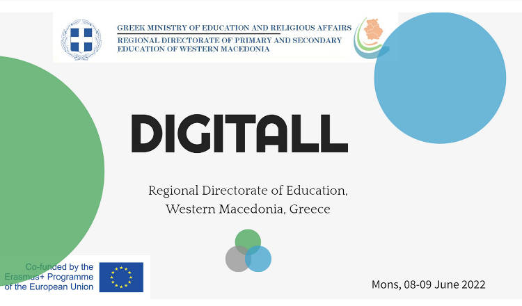 Την Τετάρτη και Πέμπτη 8 και 9 Ιουνίου 2022 πραγματοποιήθηκε η τρίτη (υβριδική) εταιρική συνάντηση (TPM) στο πλαίσιο του προγράμματος Erasmus+ (κωδικός προγράμματος: 2020-1-BE01-KA226-SCH-082731) με τίτλο “DigitALL” στη Μονς στη Γαλλία. Η Περιφερειακή Διεύθυνση Εκπαίδευσης Δυτικής Μακεδονίας. συνεργάζεται με δημόσιους και ιδιωτικούς εκπαιδευτικούς οργανισμούς από την Ιταλία, την Πορτογαλία, τη Ρουμανία και δυο από το Βέλγιο, ο ένας από τους οποίους είναι και ο συντονιστής του προγράμματος. Βασικός σκοπός του προγράμματος είναι να παρέχει καθοδήγηση και υποστήριξη στους εκπαιδευτικούς πρωτοβάθμιας και δευτεροβάθμιας εκπαίδευσης για την προσαρμογή ψηφιακού υλικού στις ανάγκες των μαθητών με ειδικές ανάγκες στο πλαίσιο της συμπεριληπτικής παιδαγωγικής προσέγγισης.