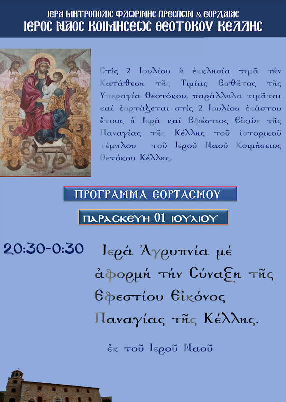 Ἱερά Ἀγρυπνία μέ ἀφορμή τήν Σύναξη τῆς Ἐφεστίου Εἰκόνος Παναγίας τῆς Κέλλης.