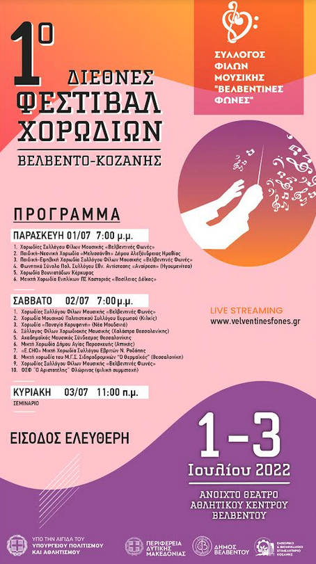 Ανοίγει η αυλαία για το κορυφαίο χορωδιακό γεγονός της Δυτικής Μακεδονίας, το 1ο  Διεθνές Φεστιβάλ Χορωδιών το οποίο θα πραγματοποιηθεί  από 1 εως 3 Ιουλίου 2022 στο Βελβεντό Κοζάνης