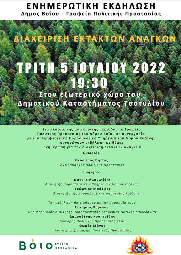 Βόιο 01/07/2022 Δήμος Βοΐου: Ενημερωτική εκδήλωση για τη διαχείριση εκτάκτων αναγκών 0 Δήμος Βοΐου: Ενημερωτική εκδήλωση για τη διαχείριση εκτάκτων αναγκών. Περισσότερες πληροφορίες στην παραπάνω αφίσα.