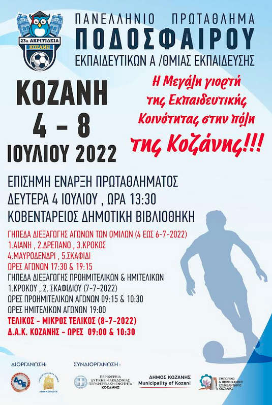 Αθλητικά, Κοζάνη 01/07/2022 Στην Κοζάνη το Πανελλήνιο Πρωτάθλημα Ποδοσφαίρου Εκπαιδευτικών Α/θμιας Εκπ/σης 0 Η καρδιά της Ελλάδας και της Κύπρου χτυπάει στην πόλη της Κοζάνης. Πανελλήνιο Πρωτάθλημα Ποδοσφαίρου Εκπ/κων Α/θμιας Εκπ/σης από 4-8 Ιουλίου. 20 Ομάδες – 40 Αγώνες – 500 Συμμετέχοντες!