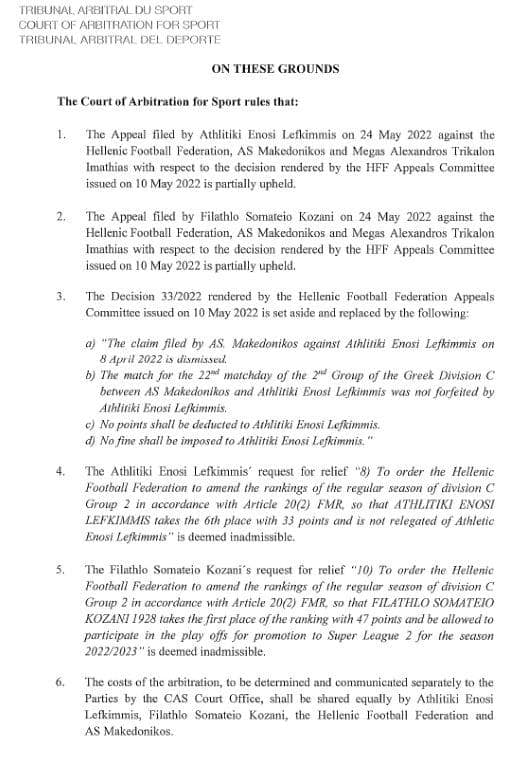 Δικαίωση! Η Κοζάνη ξέρει να αγωνίζεται νόμιμα κι αντρίκια μέσα και έξω από τα γήπεδα. Το CAS δικαίωσε οριστικά την ομάδα μας. Το Αθλητικό Διαιτητικό Δικαστήριο έκανε δεκτά τα ασφαλιστικά μας μέτρα και η πόλη μας πετά στον έβδομο ουρανό. Ο συνδυασμός αγωνιστικού σθένους και στιβαρής διοίκησης μας δικαίωσε όλους. Κοζάνη! Πάντα δυνατά, πάντα ψηλά!
